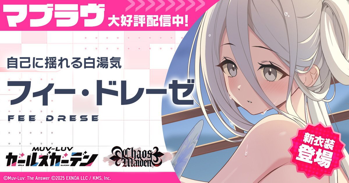 合同会社EXNOAとKMSは11月25日、PC(ブラウザ/DMM GAME PLAYER)/Android(DMM GAMESストア)にてサービス中のマブラヴ最新作『マブラヴ ガールズガーデン』(以下、マブガル)について、新イベント【アマツ混沌温泉物語】を開催したと発表。また、新衣装の「フィー・ドレーゼ」【自己に揺れる白湯気】が登場している。