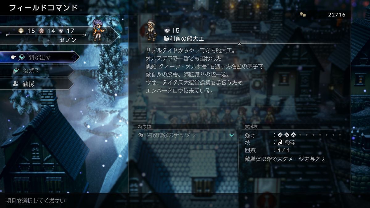 「オクトラ」シリーズ共通で楽しいのが、フィールドコマンドを使用した収集要素だ。新しい町へ着くたびにワクワクでき、「旅をする楽しさ」を味わえるこのシステムは、もちろん本作でも健在。