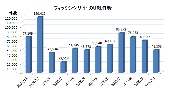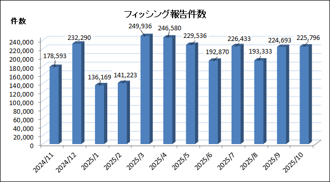 フィッシング対策協議会が11月に発表した、2025年10月分の「フィッシング報告状況」によると、「報告件数」は前月から1103件増えて、22万5796件でした。