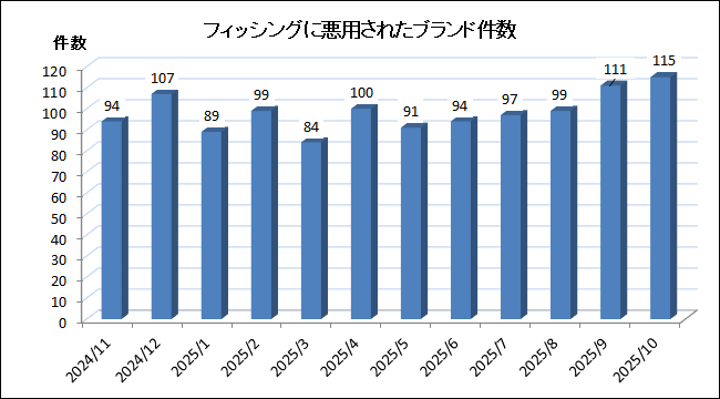 悪用された「ブランド件数」は前月より4ブランド増えて115件になりました。内訳はクレジット・信販系が23ブランド、金融(銀行)系17ブランド、証券系10ブランド、オンラインサービス系10ブランド、通信事業者・メールサービス系8ブランド、決済系7ブランド、そしてEC系が7ブランドでした。