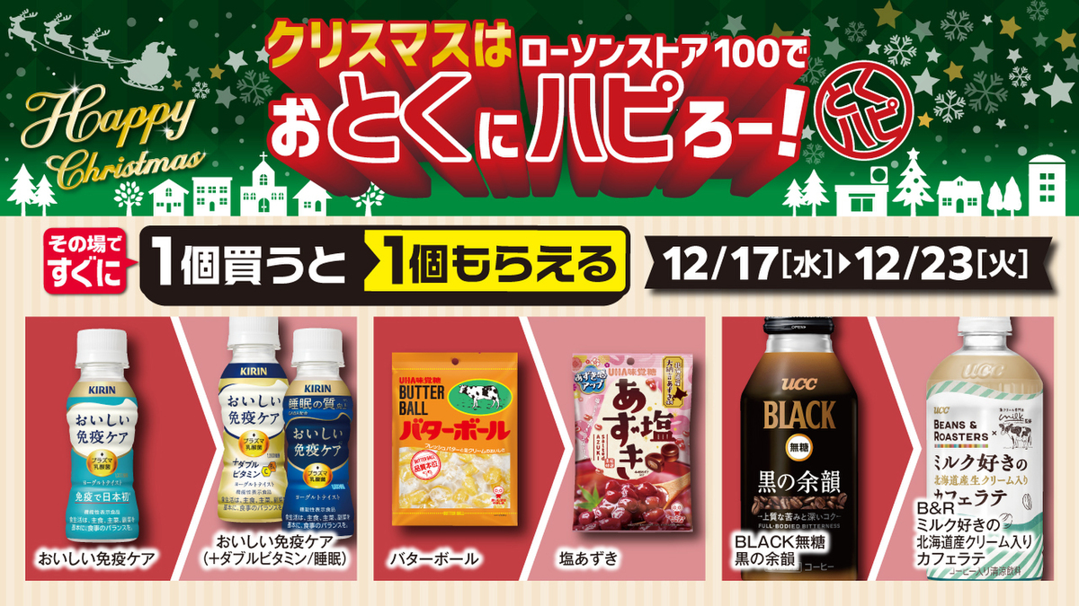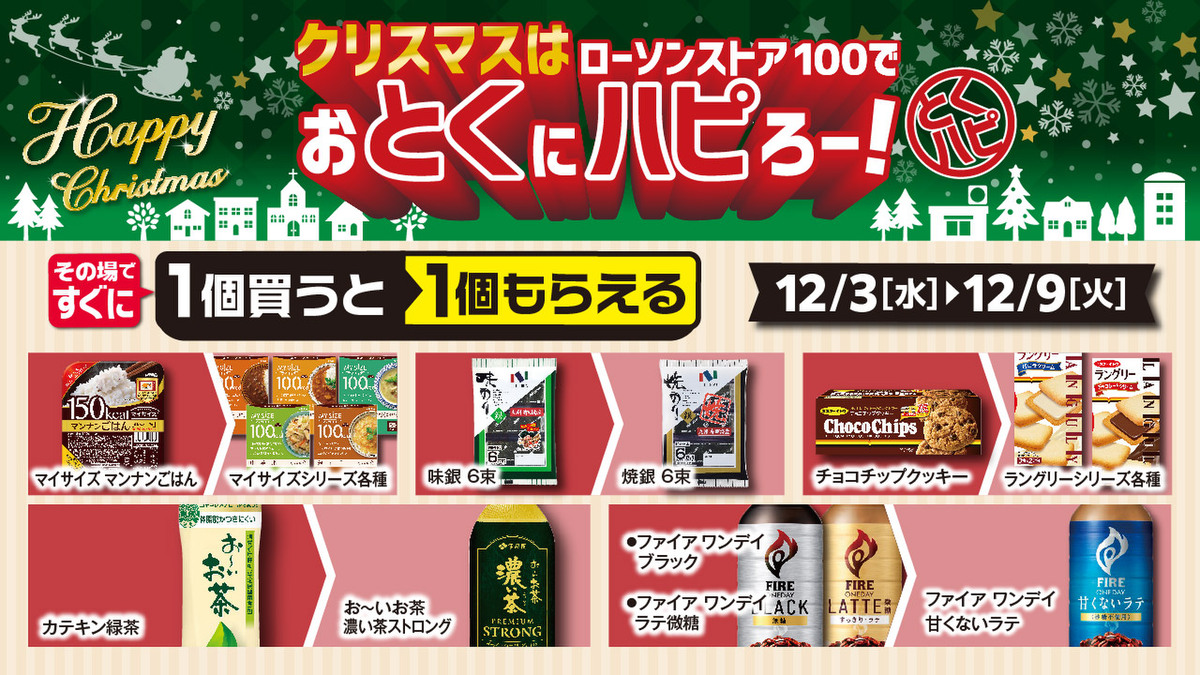 ローソンストア100は12月3日~25日の期間、クリスマス向けの企画「クリスマスはローソンストア100でおとくにハピろー!」を実施します。