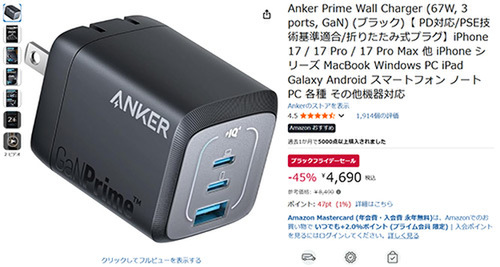 最大出力67W、3ポートを搭載した充電器が、参考価格8,490円のところ、45%オフの4,690円で手に入ります。この機会に充電環境をアップグレードしましょう。