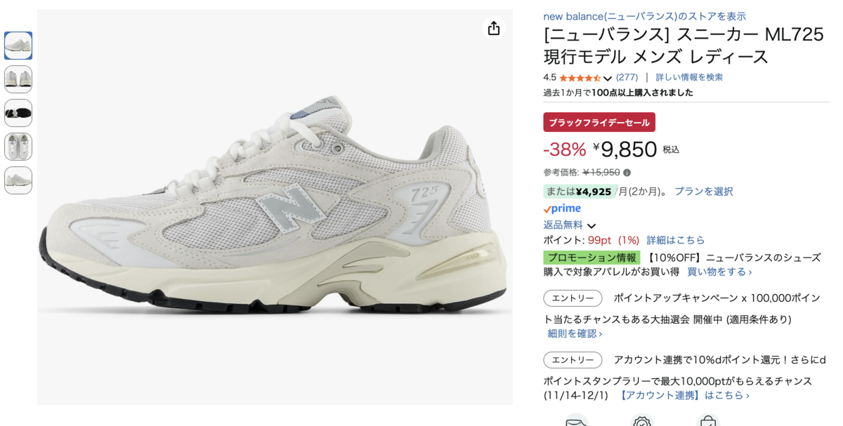 ニューバランスの人気スニーカー、ML725 現行モデルが38%OFFの9,850円で登場しています。