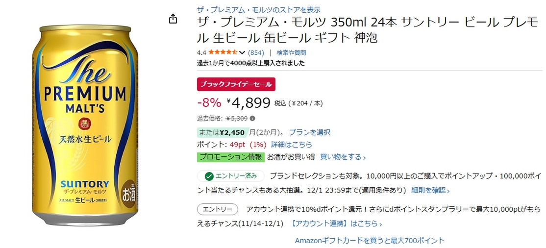 12月1日まで開催中のAmazonブラックフライデーでは、ザ・プレミアム・モルツ 350ml 24本が4,899円のセール価格で購入できます。