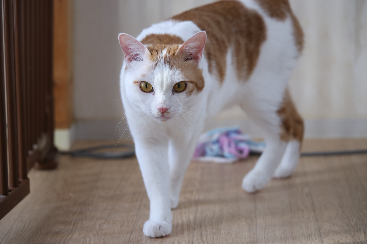 のっしのっしという感じでしょ。動いてる猫を確実に捉えるためにシャッタースピードは速めに(1/500~1/1000秒)にし、モニターを開いて猫の目の高さでこっちへ歩いてくるところを。