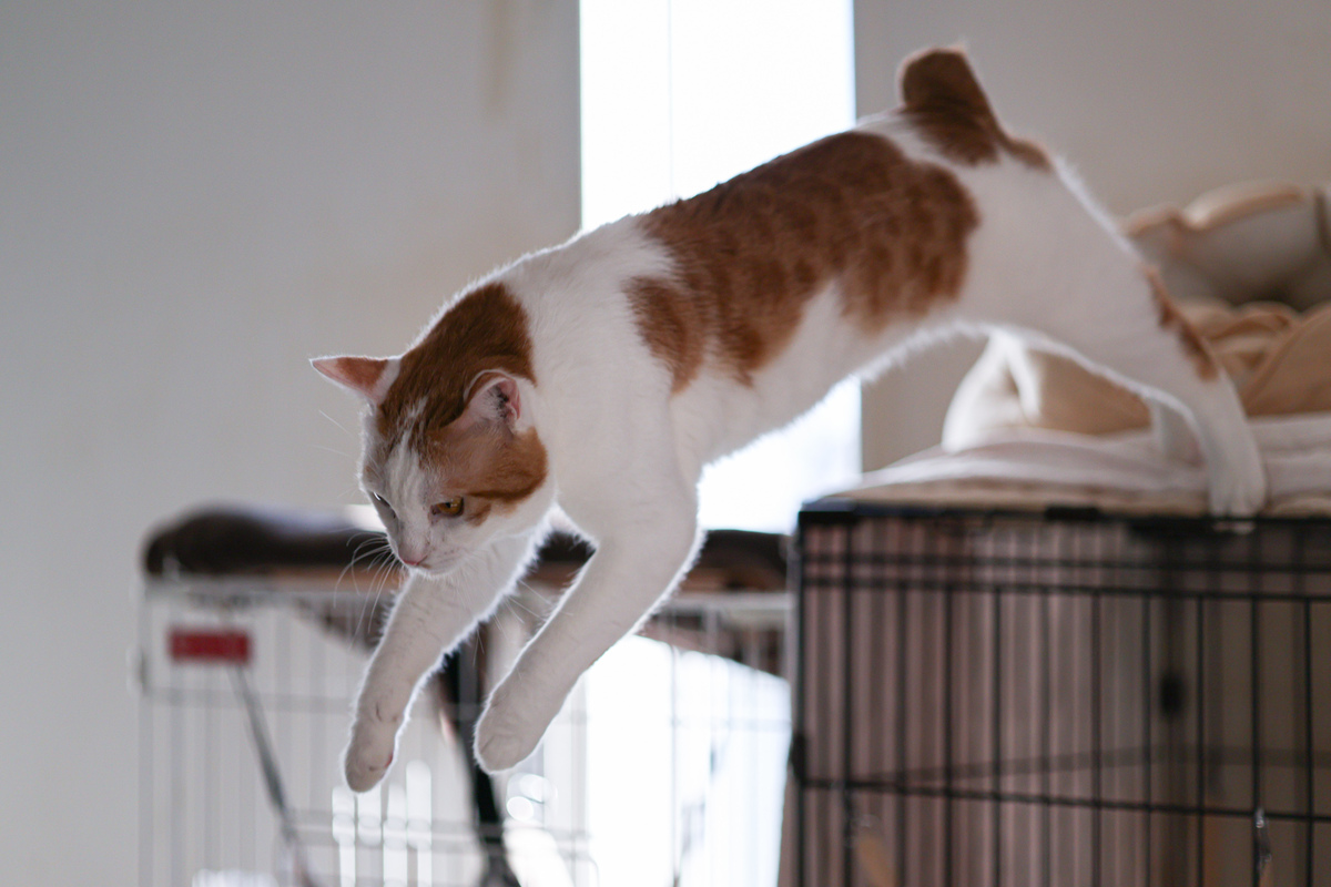 そして、おもむろに高いところにのぼり、数10cm離れた場所へ飛び移ろうとして……失敗して落ちた。足でもすべらせたか、猫にはあるまじき失態。急なことで撮りそびれました。