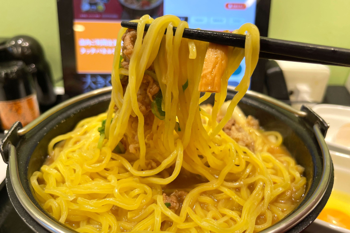 吉野家では今年夏に初の麺商品「牛玉スタミナまぜそば」を発売しましたが、その際に使用していたのは冷凍麺。麺を茹でる設備を増やしたわけではないそうです。