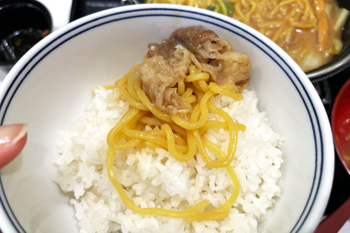 そしてご飯。最初は「ラーメン鍋にご飯いるかな?」と疑問でしたが、スープが濃いので途中からご飯が欲しくなる。結果、ご飯にラーメンをのせて食べて最高においしかったです。吉野家はご飯のおかわり自由なので、たくさん食べたい人にもうれしいです。
