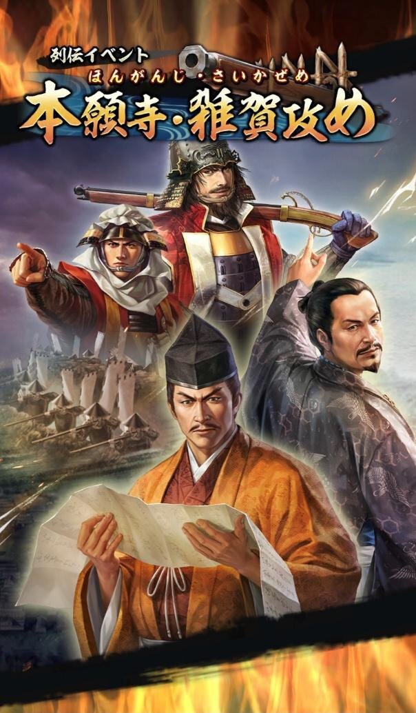 列伝イベントは、歴史上の有名な合戦などをテーマにした物語を追体験しながら、強者(つわもの)との合戦を通して各種報酬の獲得を目指すイベント。今回のイベントでは、新たな世へ邁進する織田信長と、打倒織田信長の狼煙を上げ抵抗する本願寺・紀伊雑賀衆との戦いが描かれる。