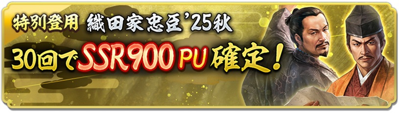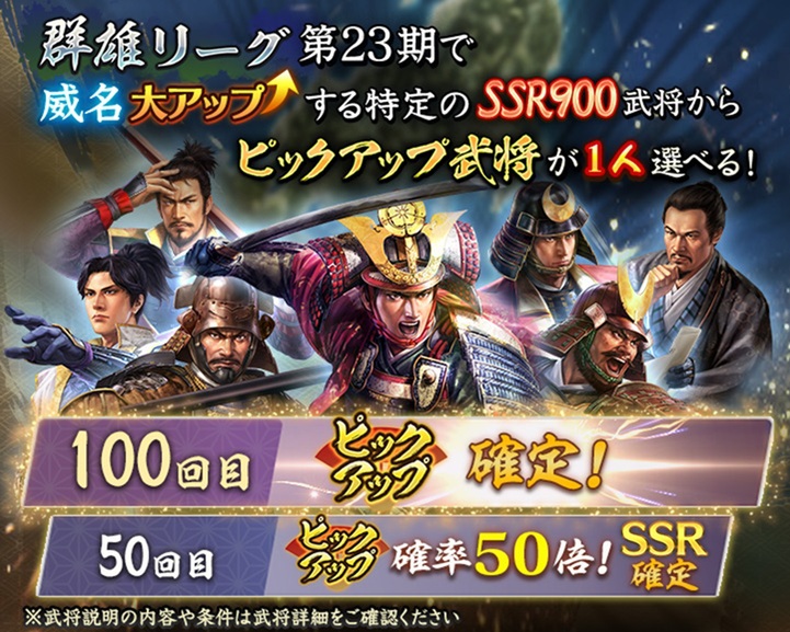 「特別登用・群雄 第23期」では、対象の「織田家」のSSR初期威名900武将の中から、いずれか1名をピックアップ武将として選択可能。