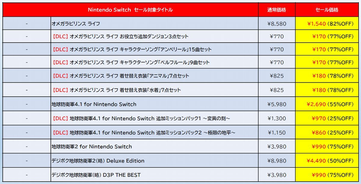 今回のセールでは、『地球防衛軍4.1』ゲーム本編と追加ミッションパックが大幅値引き。さらに『オメガラビリンス ライフ』ゲーム本編と追加ダンジョンセットなどの人気DLCが大特価となっている。
