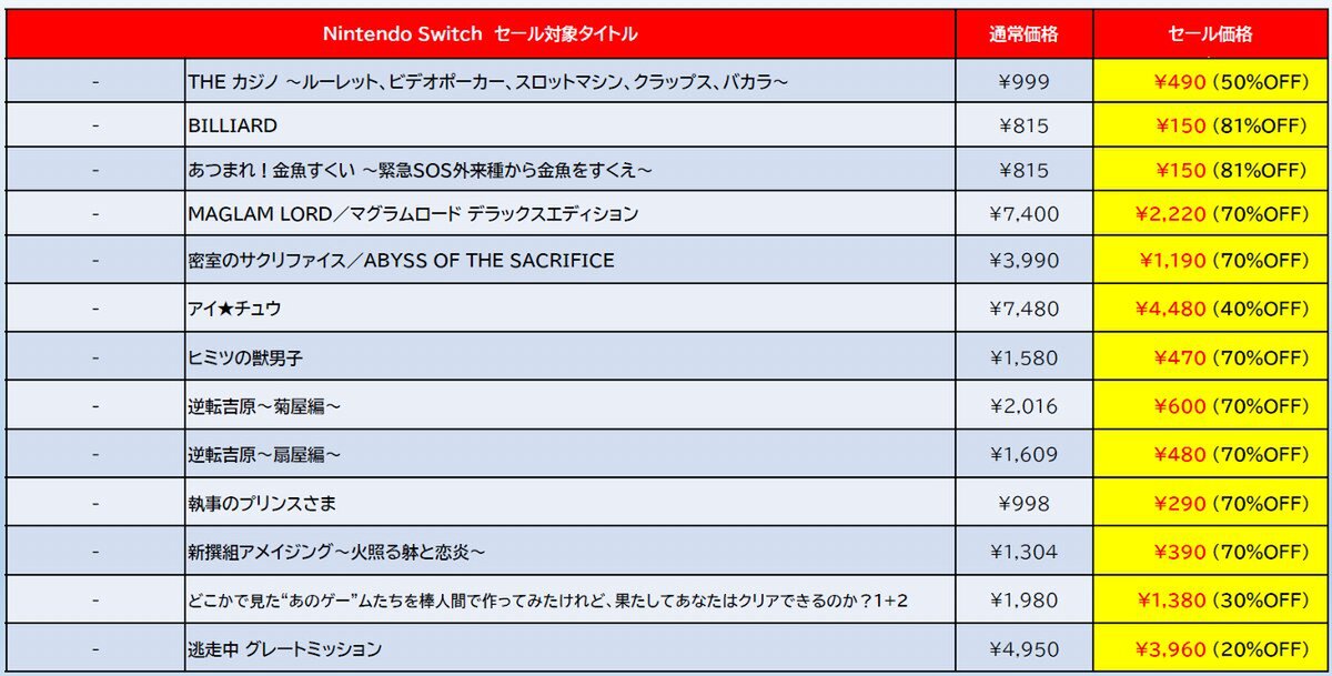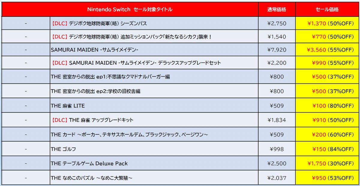 以下ではセールタイトルの一部を紹介。全セールタイトルは下記のリストか、ニンテンドーeショップを確認してほしい。