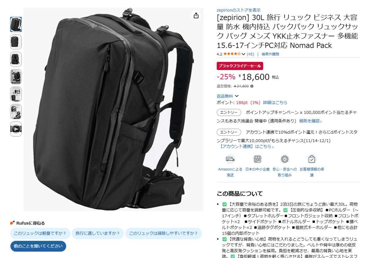 「荷物が多くなりがち」「移動が多い」「整理しながら持ち歩きたい」そんな方にぴったりの「Nomad Pack」は、Amazonブラックフライデーセールでお得に購入できます。