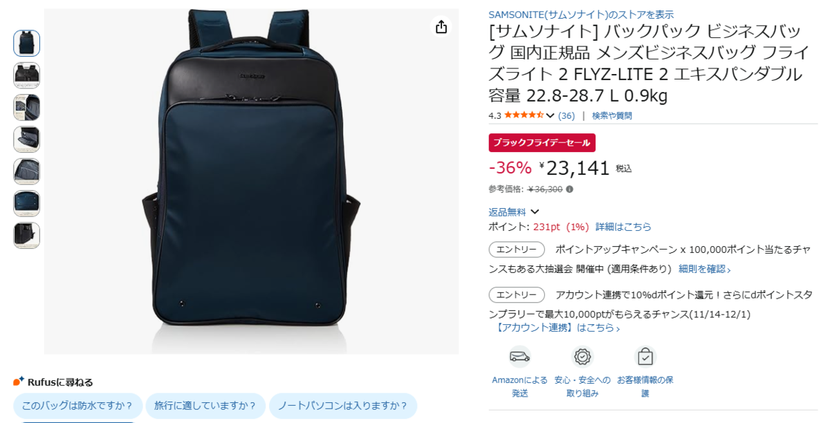 軽さ・収納力・拡張性を兼ね備えたサムソナイトの定番ビジネスリュック「FLYZ-LITE 2」は、Amazonブラックフライデーセールでお得に購入できます。