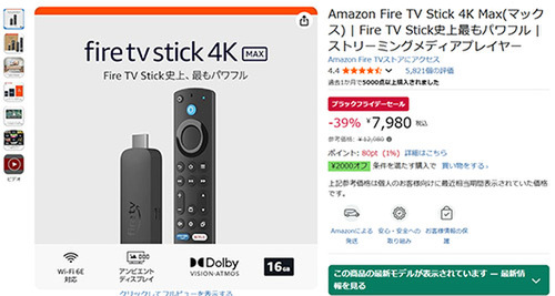 Fire TV Stick史上、もっともパワフルなモデルが、参考価格12,980円のところ、39%オフの7,980円という大幅割引価格で手に入ります。