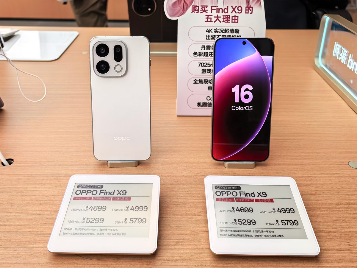 Find X9シリーズは工場見学時にも実機を見せてもらった製品で、基本モデルの「Find X9」と上位モデルの「Find X9 Pro」の2機種が展開されています。主力製品ということで店舗でも最も目立つ位置に展示されています。
