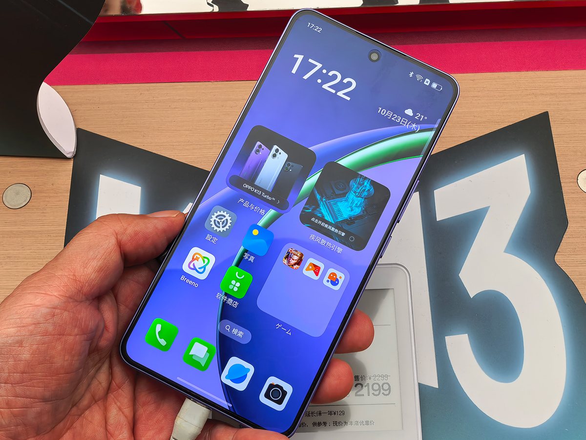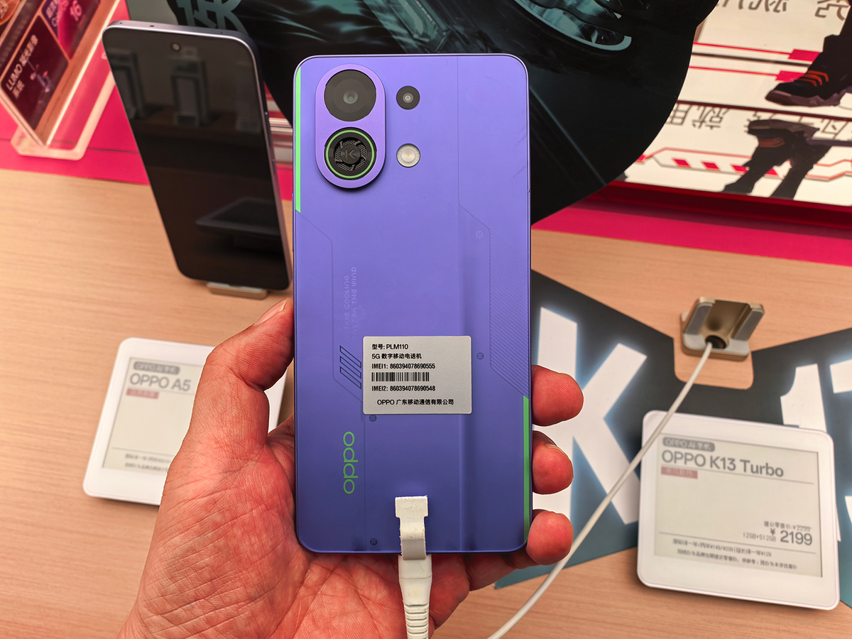 ほかには中国向けミドルレンジの「OPPO A」シリーズも数機種展示されていましたが、日本ではあまり知られていない「OPPO K」シリーズも最新モデルが展示されていました。Kシリーズはゲーミング向けのミドルハイモデルで、価格を抑えながらもパフォーマンスに優れた製品です。こちらは「K13 Turbo」で、チップセットはMediaTekのDimensity 8450を搭載します。