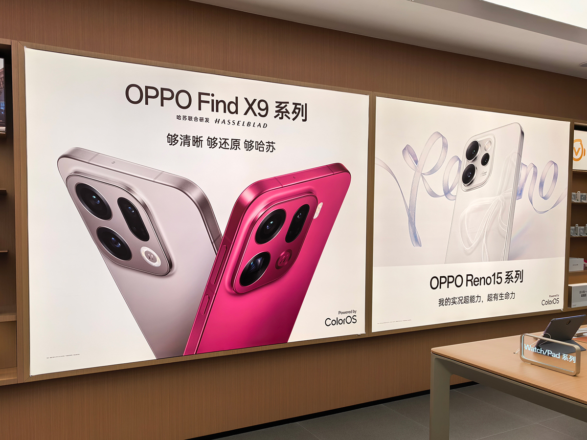 OPPOストアは深圳市内の大型ショッピングモールにたいてい入っています。以前はフラッグシップストアもあったのですが、現在は巨大店ではなく中規模なストアを多数展開する戦略に変えたようです。訪問したのは2025年11月12日で、ストア内には新製品の広告が大きく出ていました。
