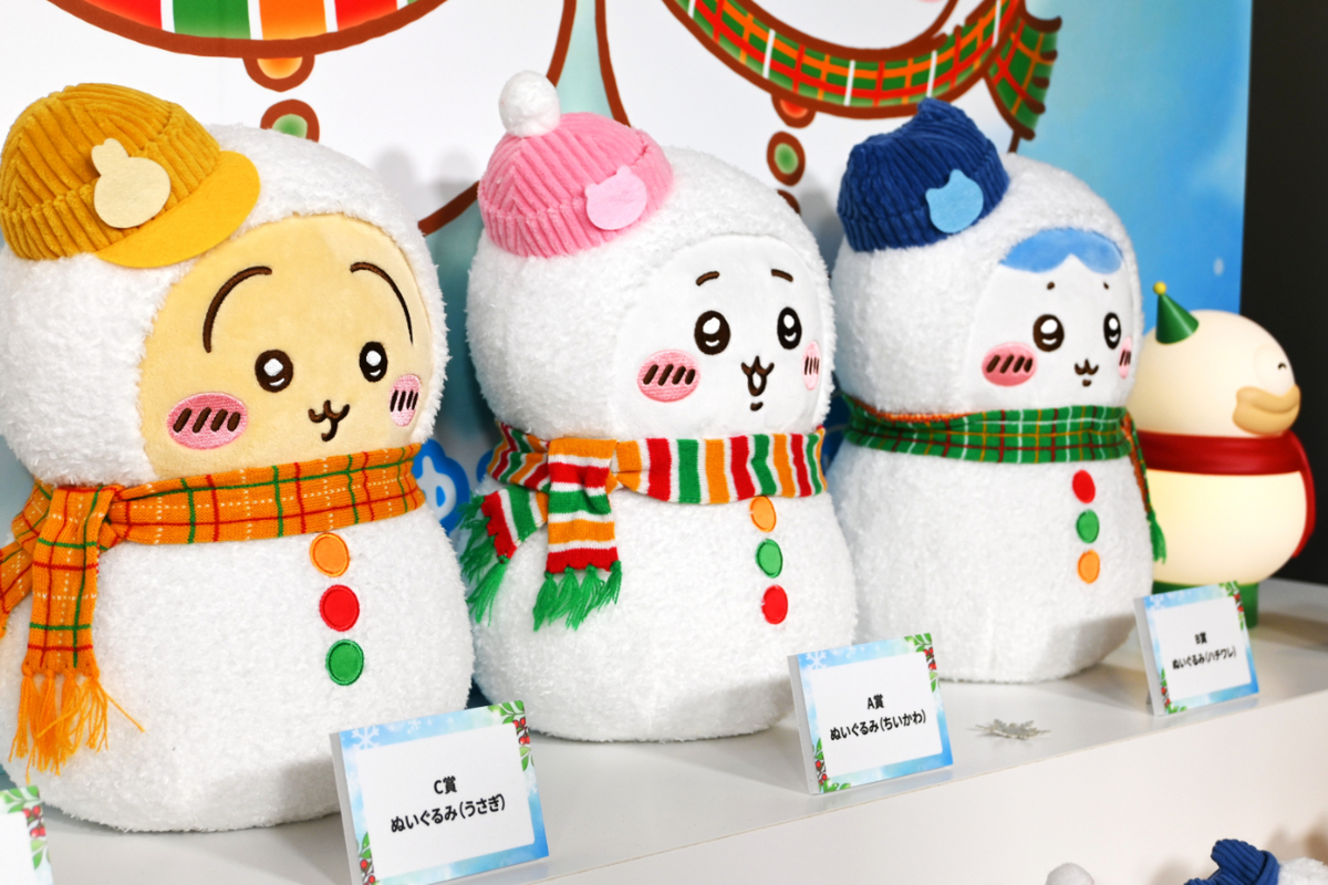 A賞~C賞はギュッとだっこできるサイズのちいかわたちのぬいぐるみ。ゆきだるま仕様でもふもふです。たまらないですね。