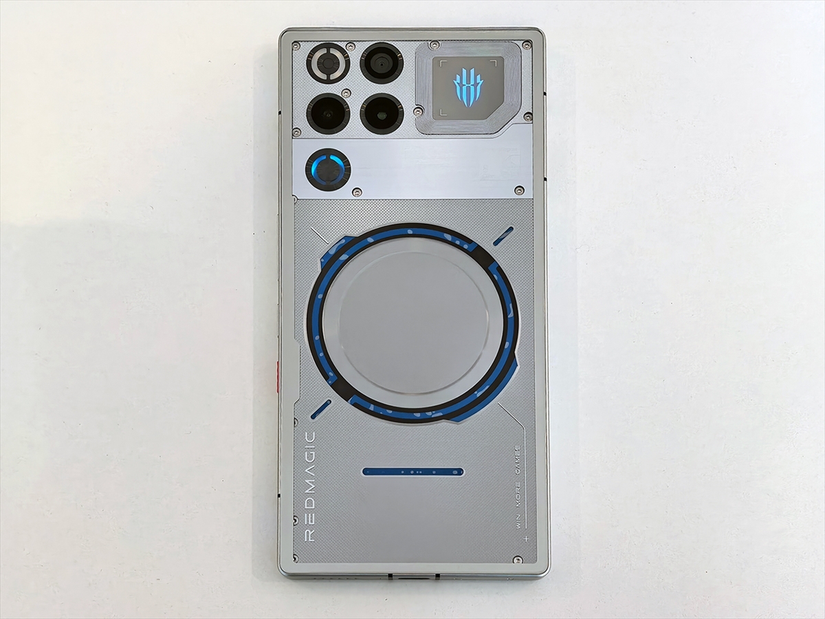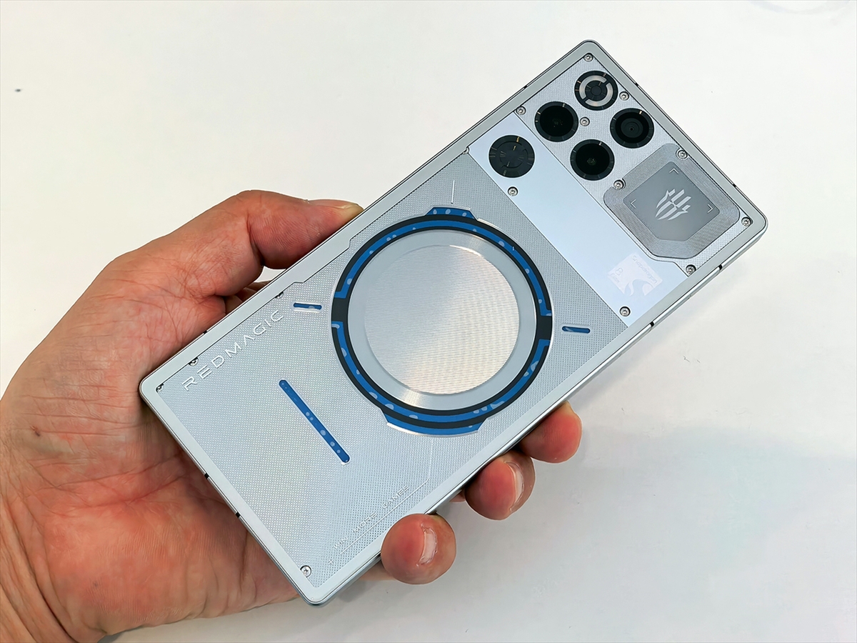 背面に大きく目立つ円形のデザインは、MagSafe系マグネットではなく、後述する水冷システムを可視化したもの。カメラ部分はレンズが3つにLEDライト、その下にある空冷ファンも同円サイズでまとめている。