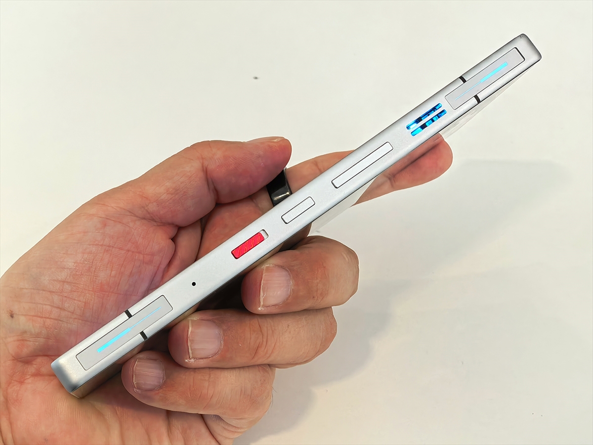 本体の右側面は一般的なスマートフォンと比べるとかなりにぎやかだ。一番上と下に見えるのはゲームプレイ用のショルダートリガーボタンだ。タッチサンプリングレートは520Hzと高速に反応する。赤いボタンはREDMAGICシリーズ共通のマジックキーで、スライドさせることでゲーム専用モード「GameSpace」を起動することができる。