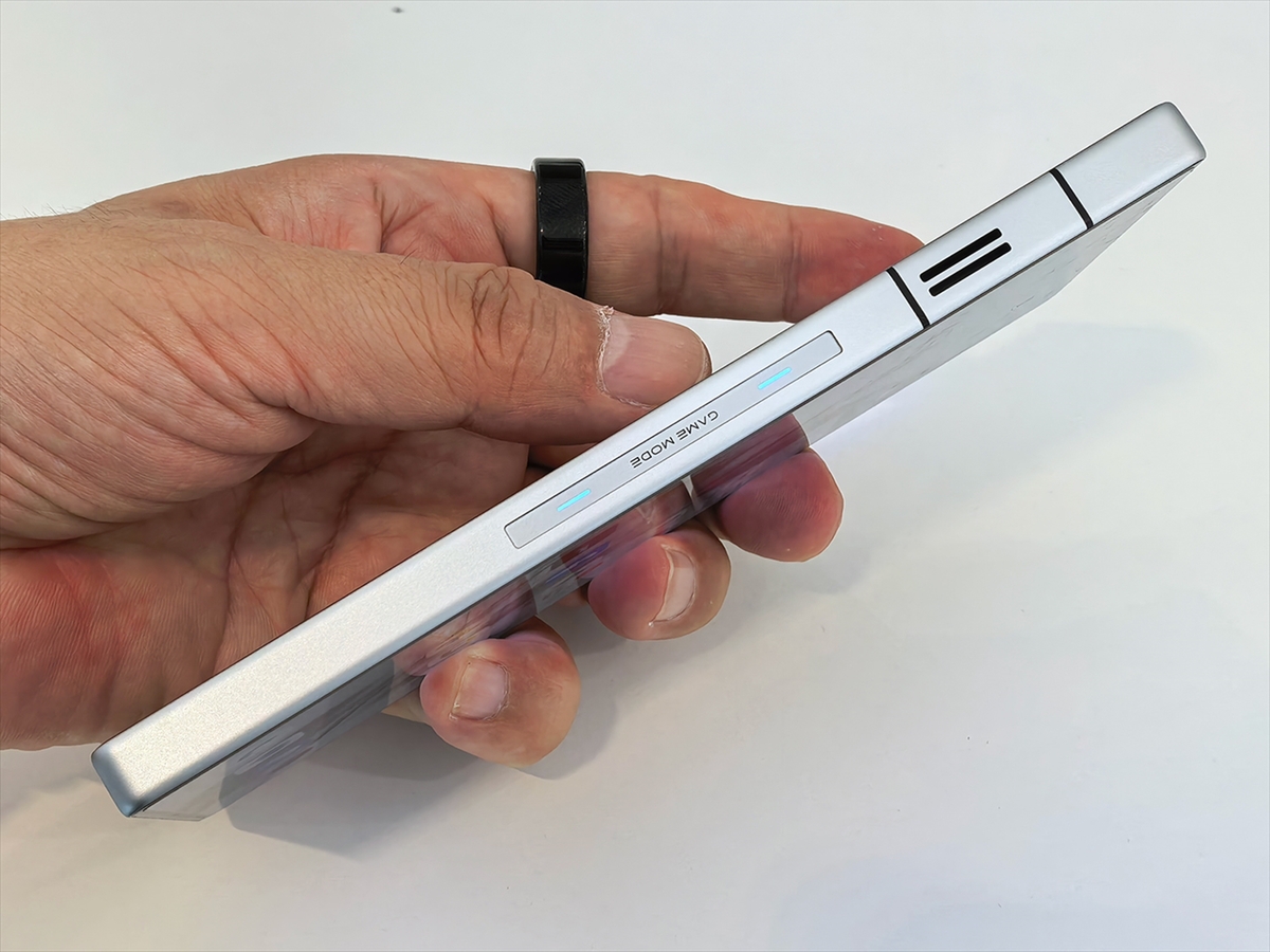 左側面はハードキーが一切ないが、中央部分には「GAME MODE」の文字とその左右にLEDライトが並ぶ。REDMAGIC 11 Proは通知や充電、またゲームに合わせてこの側面と背面の複数のLEDライトをカスタマイズできる。ショルダートリガーボタンも光らせることができるので、ゲームプレイをより楽しむことができるだろう。