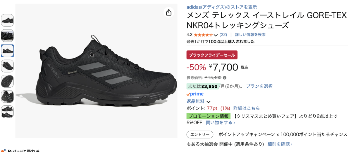 アディダスのトレッキングシューズ、テレックス イーストレイル GORE-TEX NKR04が、Amazonブラックフライデーセールとして50%OFFの7,700円で登場しています。