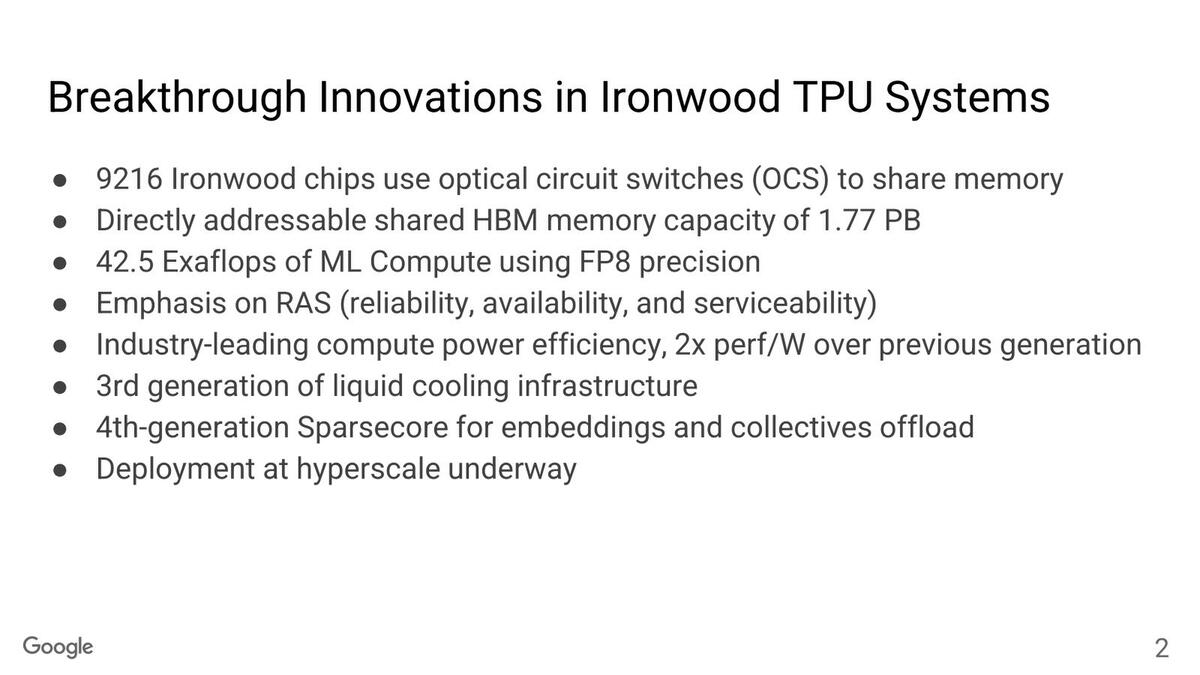 まずIronwoodの主要な特徴が下の画像だ。ここでの数字は、Googleの言うPod(9216コアを集積したサーバーラック群)での数字なので、チップあたりの容量はもっと少なくなるのだが、それにしてもなかなか意欲的である。