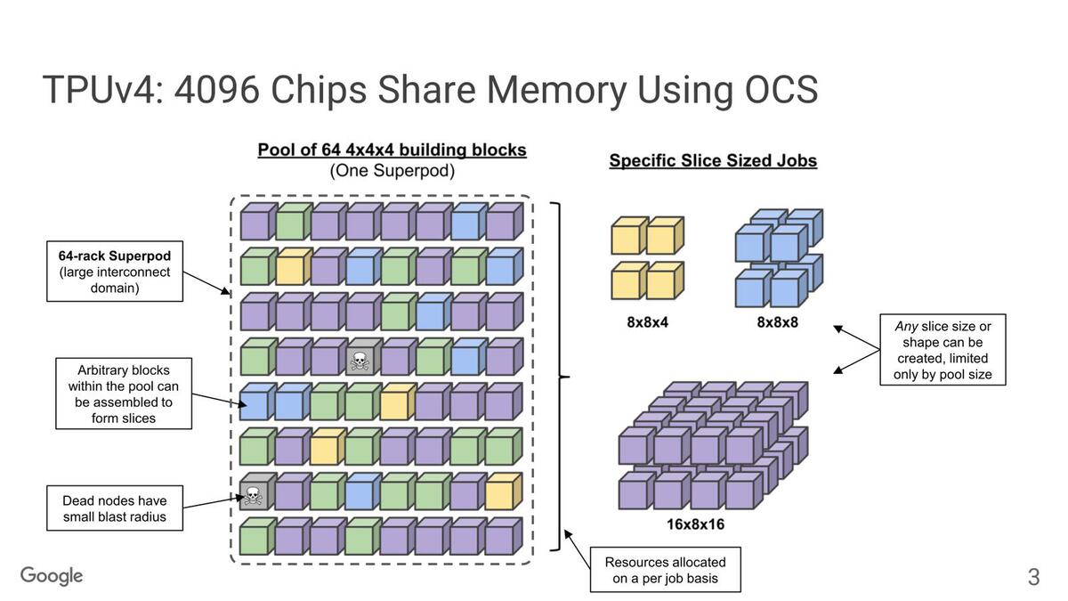 Superpodという名称はNVIDIAも使っているが、TPU v4世代では最大4096個のチップをまず64個ずつのキューブとし、このキューブを組み合わせて複数のJobを走らせるという形になっていた。