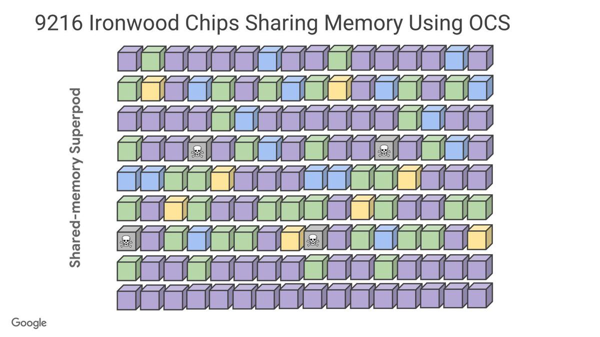 これがTPU v5p世代では8192チップ(64×8×16)に増えていたが、Ironwoodでは64×9×16=9216チップに増強された。