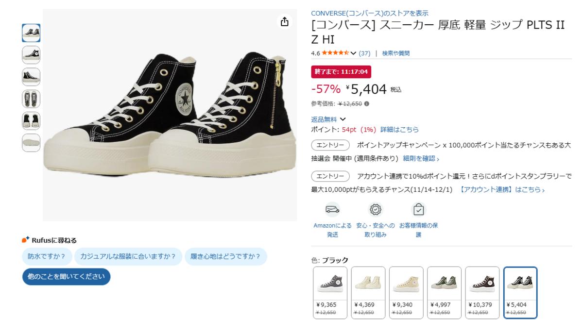 コンバースの厚底スニーカーPLTS II Z HI(24.5cm)が57%OFFの5,404 円で、11月24日(月)からのAmazonブラックフライデーセールに登場しています!