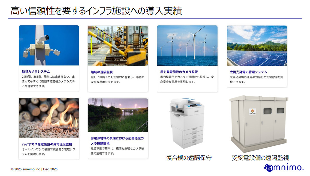 アムニモの強みは、ハードウェアからクラウド、デバイス管理、AI活用に至るまで、自社で一気通貫して提供できる点だ。屋外や産業用途へ向けた機器開発を長年続けてきた経験を活かし、雷対策、防水、防湿コーティング、気圧コントロール、直射日光や温度変化への耐性など、屋外使用で想定される要素を一つの筐体に集約している。
