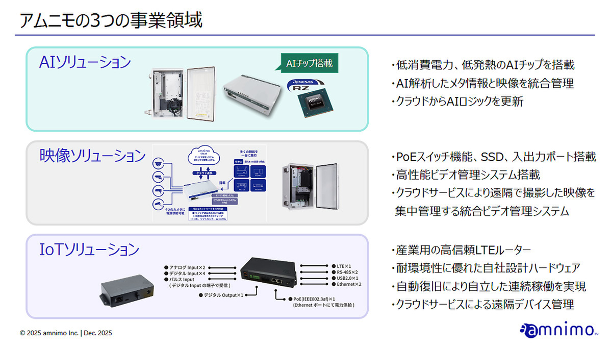 アムニモが提供するソリューションは大きく「AI」「映像」「IoT」の3領域に分かれる。アムニモではこれらを個別サービスとして切り出すというよりも、業務課題や利用環境に応じてハード・ソフト・クラウドを一体で成立させている。「映像をIoTの延長線上にある入力データとして扱い、そこにAIやクラウドを組み合わせることで、お客様の現場に必要な形に仕上げていく」(小嶋氏)というアムニモが提供するソリューションを紹介しよう。