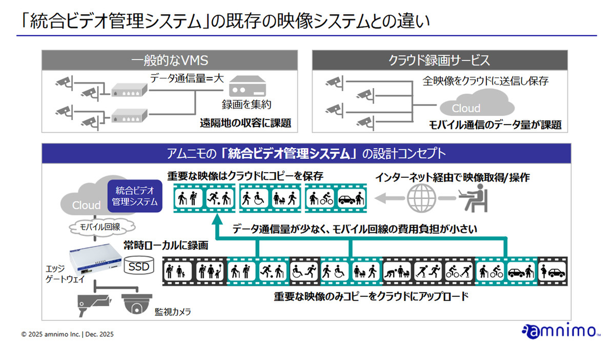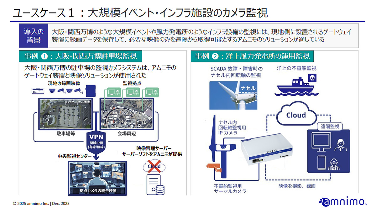 このように「落とせない環境」を前提とするアムニモの映像プラットフォームはエッジ録画とクラウド録画を組み合わせたハイブリッド構成になっている。100拠点規模のカメラをクラウド側で一元管理するケースでは、放送局が扱う6Mbps級の高画質映像も処理できる構成をテレビ局向けに提供し、数百台単位の映像配信を低遅延で行う仕組みを実現しており、他局への横展開も進めており、各局の映像業務を支えていく予定。