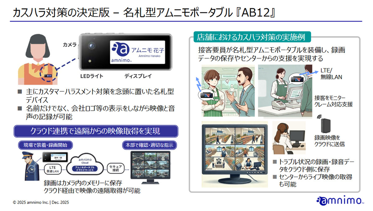 また2026年10月から施行される予定のカスハラ対策法に対応した、ネームプレート型映像監視ソリューションも開発。医療、福祉、鉄道、サービス業など、従業員の業務に支障が出るカスタマーハラスメントの防止策の一環として開発されたこのソリューションは、様々な企業から引き合いがきているという。