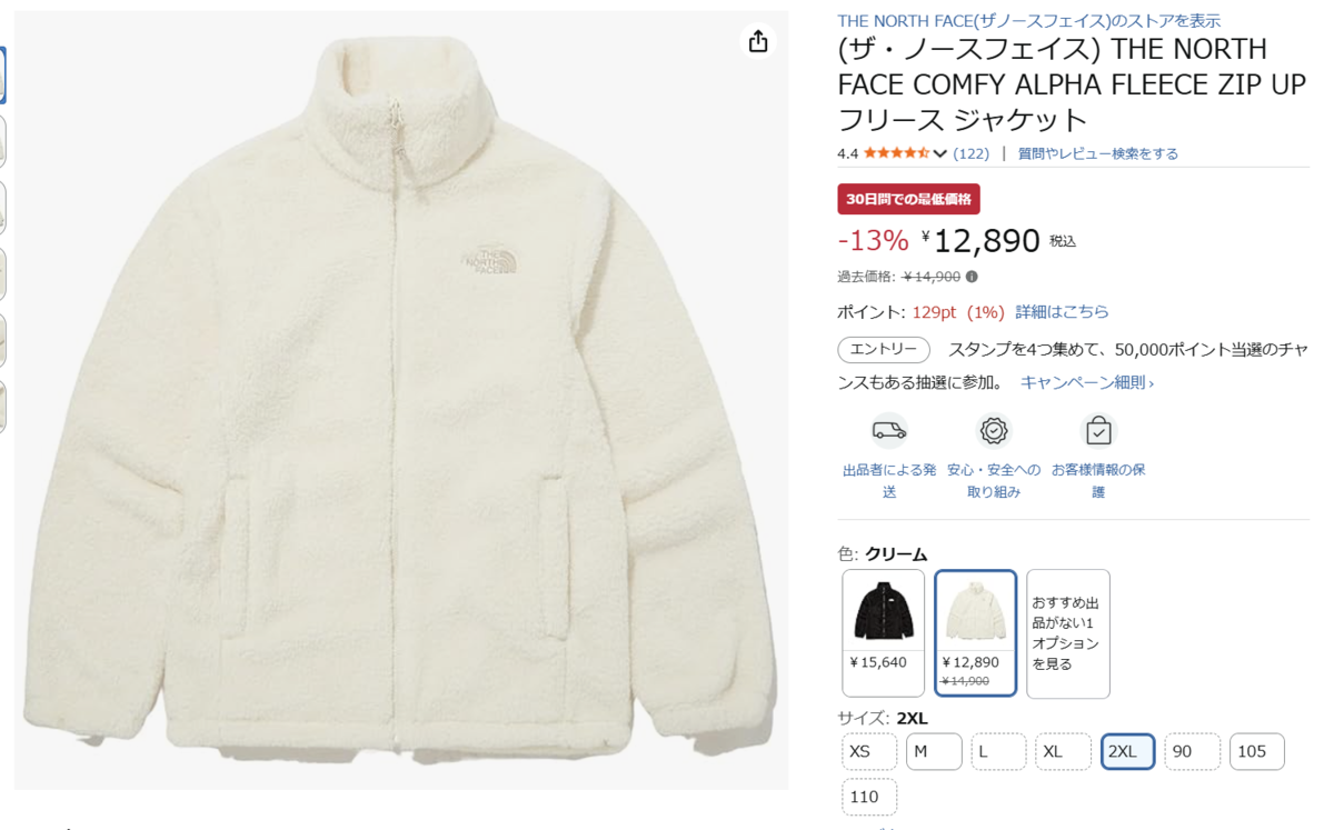 12月1日で終了した、Amazon最大のセール「Amazonブラックフライデーセール」でも、COMFY ALPHA FLEECE ZIP UP(2XL)の販売価格は12,890円で、なんと現在と同じ。いまでも、お得な価格で買えてしまうのです。