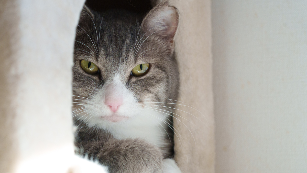 望遠ばっかになっても味気ないので、ここからはいつもの保護猫シェルターqueueで室内猫編。こんな感じでそっと狙う……、全然「そっと」じゃないけど、めちゃ不審がられてるし。