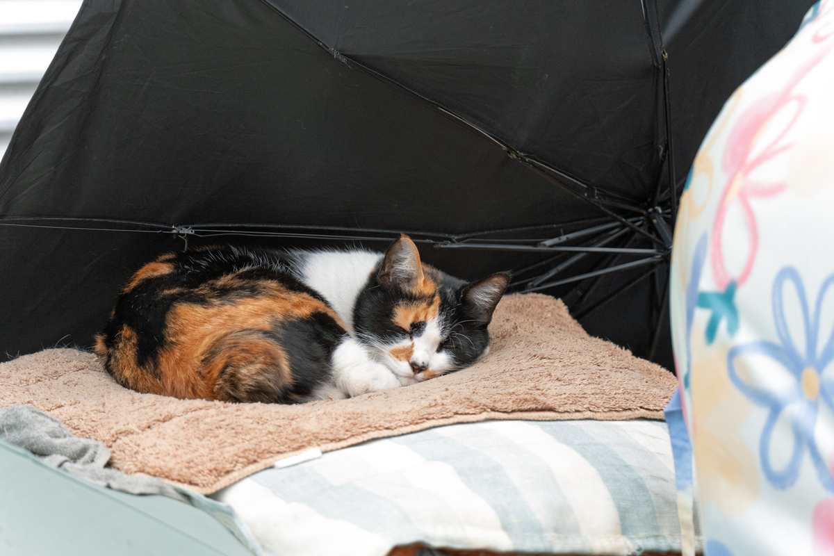 いるかな、とのぞいてみるのがクセになりつつある。どうやらこのおうちの人が猫を何匹か世話しているようで、先日は猫用に作られたベッドで気持ちよさそうに寝てた。日よけ兼雨除けと思われる傘まで用意してもらってる。