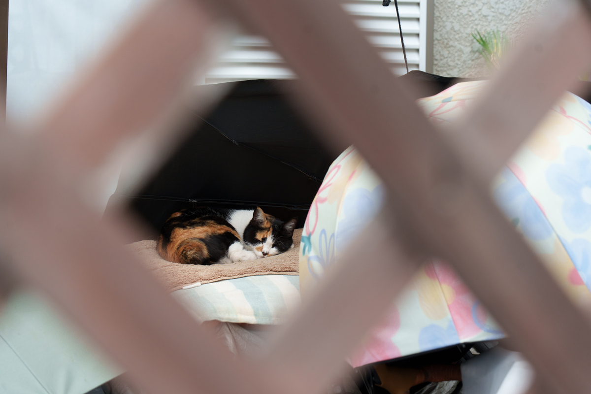 わざと手前の格子を入れて、寝てるところをそっとのぞいてる感じの写真にしてみた。傘はもちろん猫のため。ときどきこの猫の前でおじさんが自転車の修理をしてる(けど自転車屋さんではないらしい)。2025年11月 ソニー α7C II