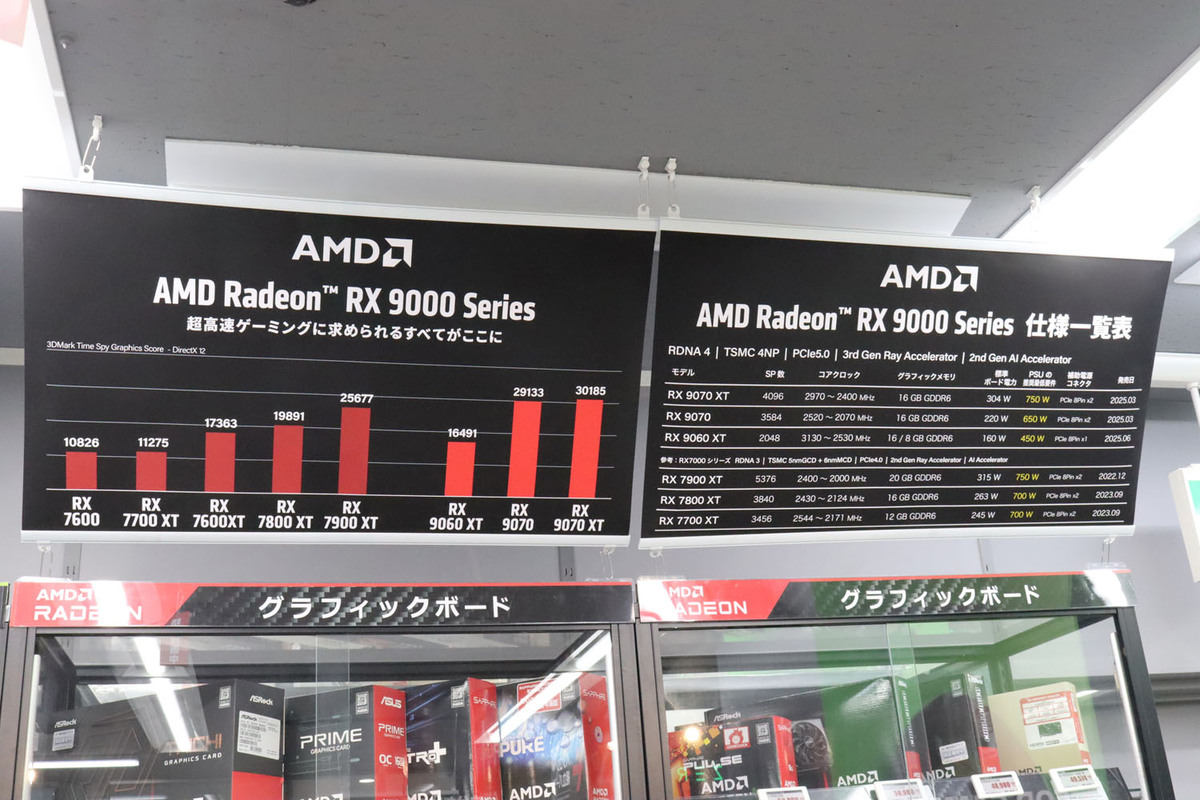 CPUの売れ筋は「Ryzen 7 9700X」と「Ryzen 7 9800X3D」の人気が高く、次いで「Ryzen 5 5500GT」や「Ryzen 7 5700X」などのSocket AM4勢も根強い人気があるようだ。総合的なCPU売れ筋トップ10圏内には「Ryzen 9 9950X」といったハイエンドCPUも含まれており、ローエンドからハイエンドまで幅広くAMD CPUが売れ筋を占めている状態だという。