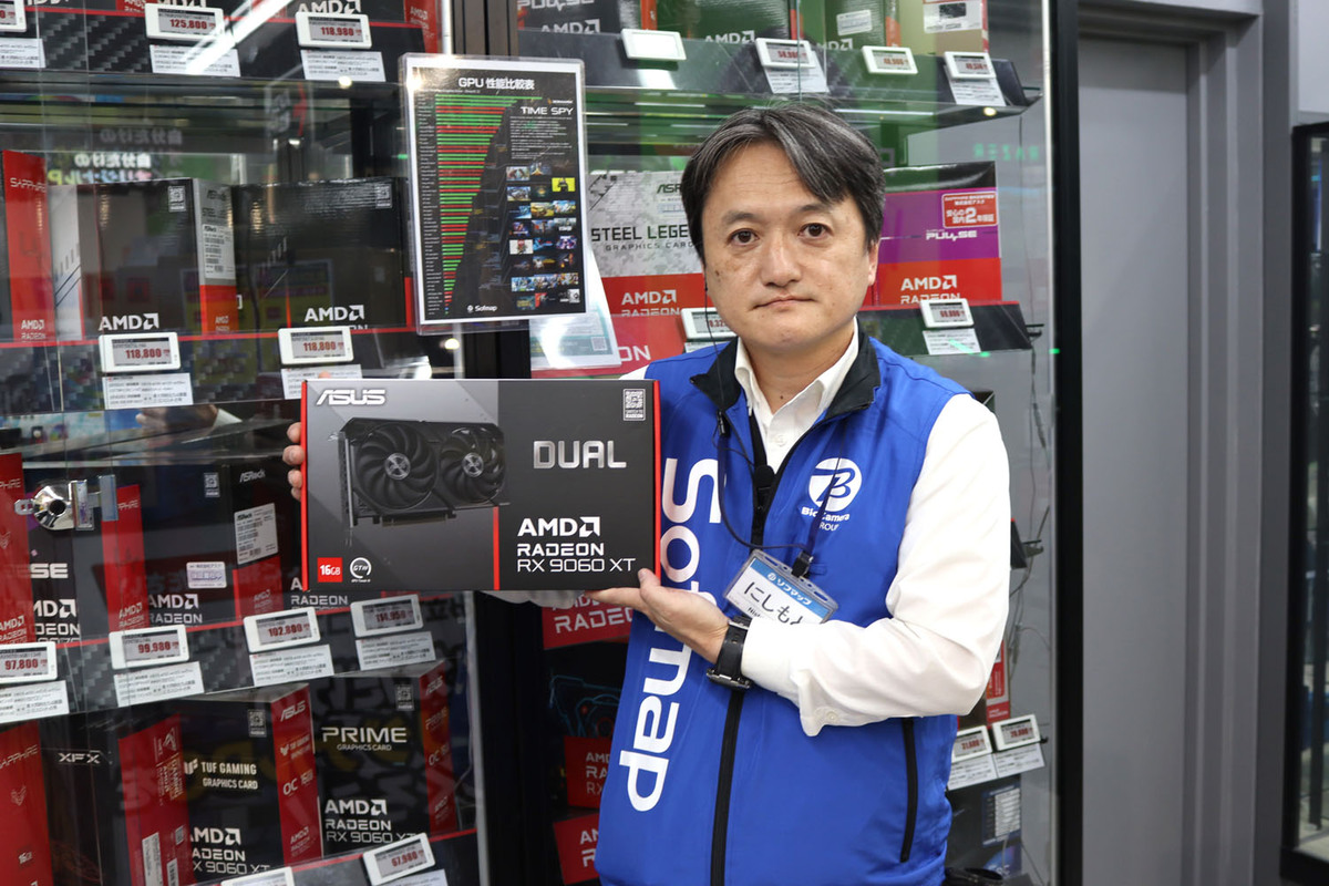 次に、ビデオカードの売れ筋を聞いたところ、ASUS「DUAL-RX9060XT-16G」が人気とのこと。昨今はビデオカードのビデオメモリー容量が重要視されるようになり、低コストでビデオメモリー16GBを搭載する「DUAL-RX9060XT-16G」が売れ筋になっているそうだ。