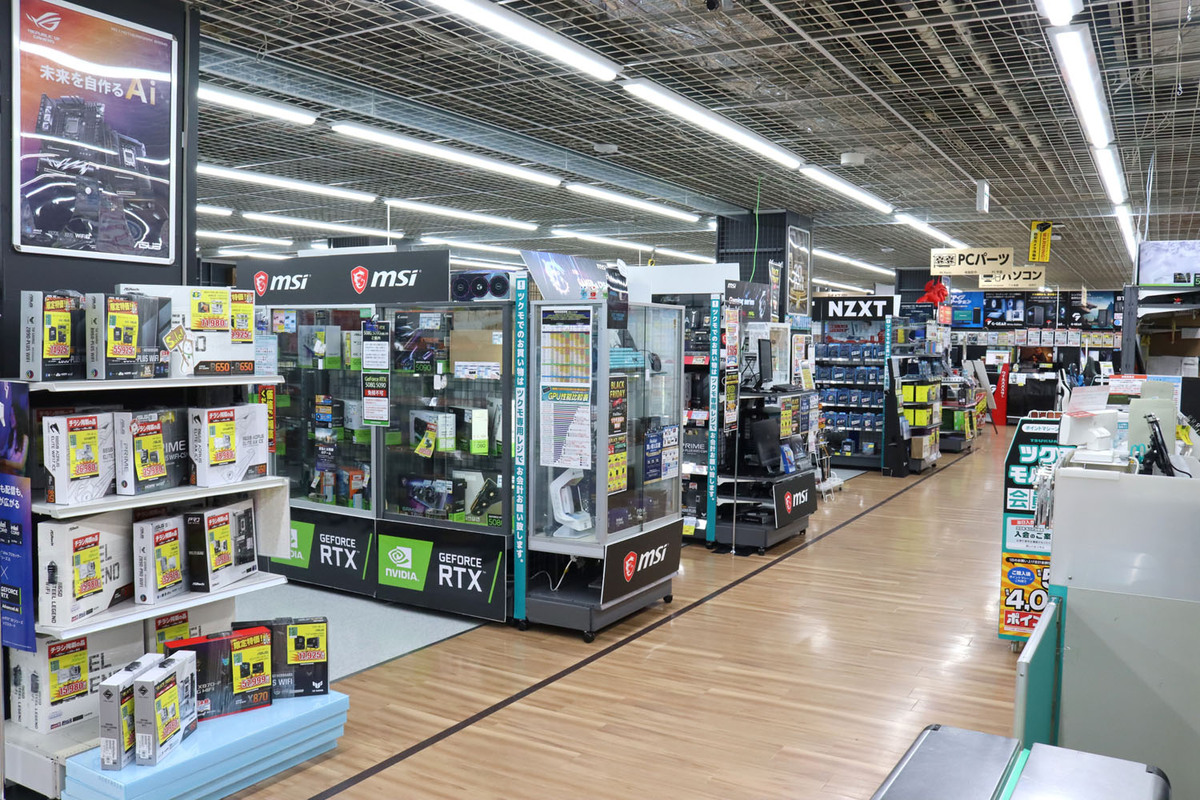 立地が「なんばパーク」寄りになり日本橋のメイン区画から少し離れてしまったが、超大型店舗内に移転したことで車による買い物がとても便利に。PCケースなどの大型パーツやBTO PCの持ち帰りも楽にこなせる店舗となっている。ここで、店舗スタッフの盛田さんから売れ筋製品などの話を聞いた。