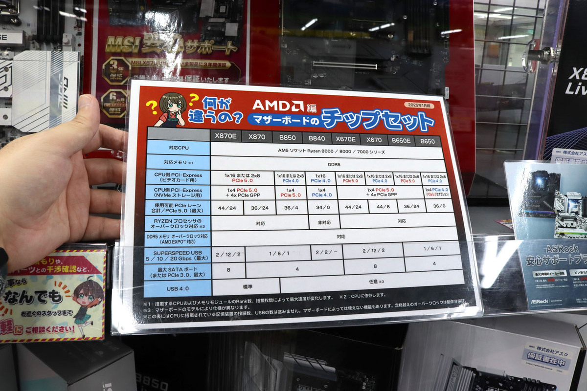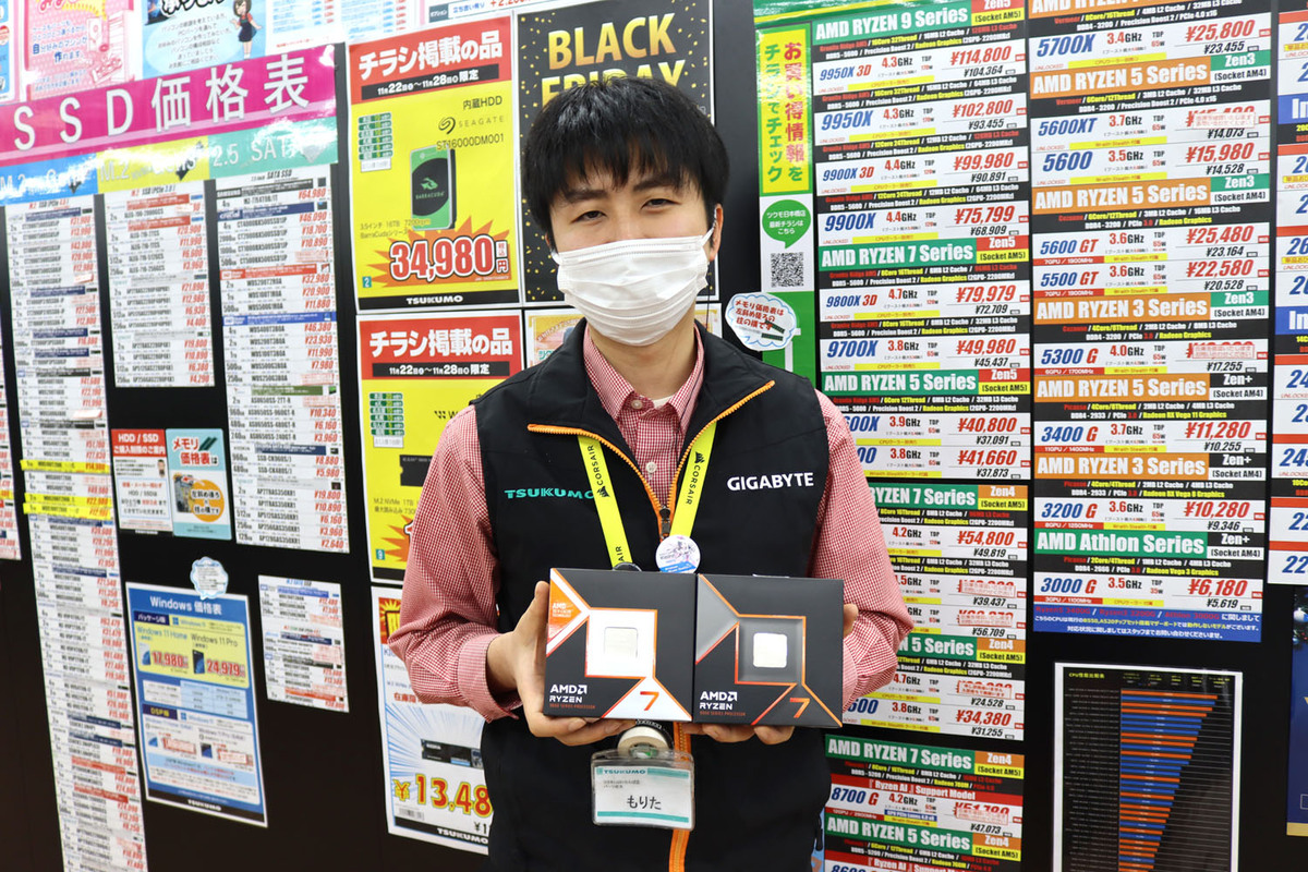 CPUの売れ筋については、価格と性能のバランスが良く、TDP65Wと冷却面でも扱いやすいことから「Ryzen 7 9700X」が一番人気となっているそうだ。次いでPCゲーマーから圧倒的な支持を受ける「Ryzen 7 9800X3D」が続くという。