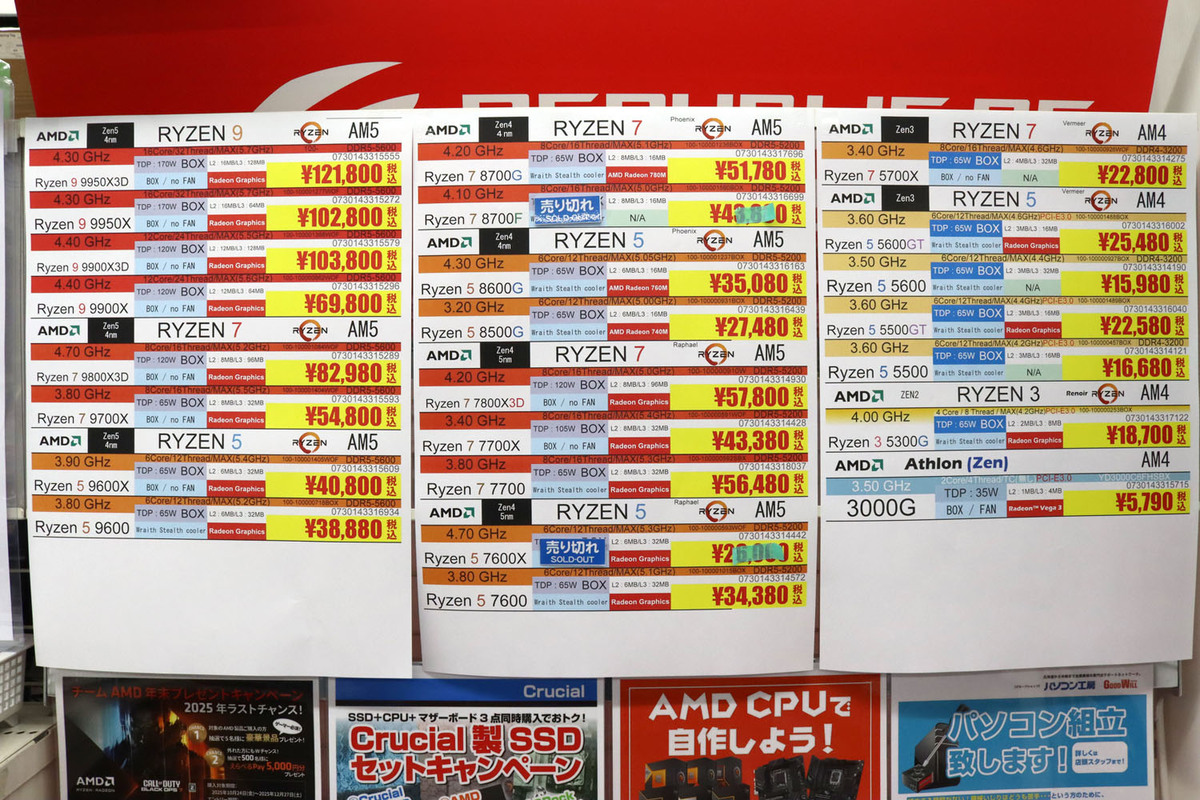 「Ryzen 7 9800X3D」への需要はひと段落した感じで、現在は価格差もあり「Ryzen 7 9700X」に人気が集まっているようである。