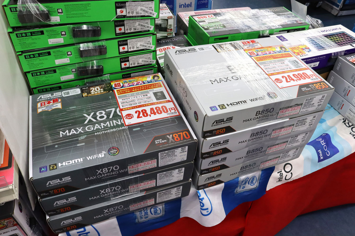 マザーボードの売れ筋はセール品を中心に変遷。セール品はレジカウンター前の平台に積み上げられている。取材時はASUS「X870 MAX GAMING WIFI7」やASUS「B850 MAX GAMING WIFI W」がセール対象だった