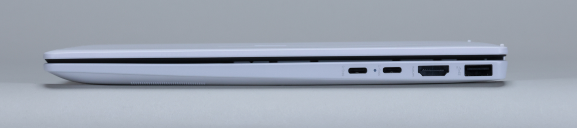 加えて、最近のモバイルノートにしては端子類も充実しています。USB Type-C(10Gbps、DP出力、USB PD対応)とUSB Type-Aが2ポートずつ、さらにHDMI 2.1と揃っていて(端子が右側に集まっているのが少々気になりますが)、幅広い用途で活用できそうなのが頼もしいところです。