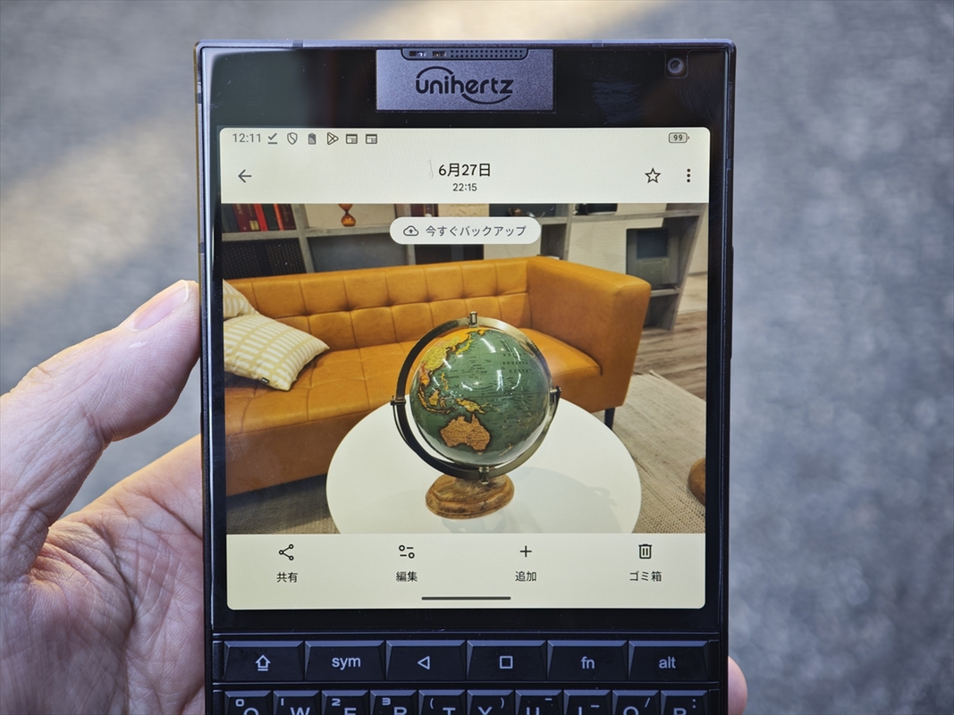 Titan 2の最大の特長はもちろん物理キーボードです。昔のBlackBerryと比較すると、キーは少々固く、コリコリとした感触であるため、指先に結構力が入る印象ですが、打ち心地自体は悪くありません。また、自動でバックライトがつくので暗い場所でも大丈夫です。