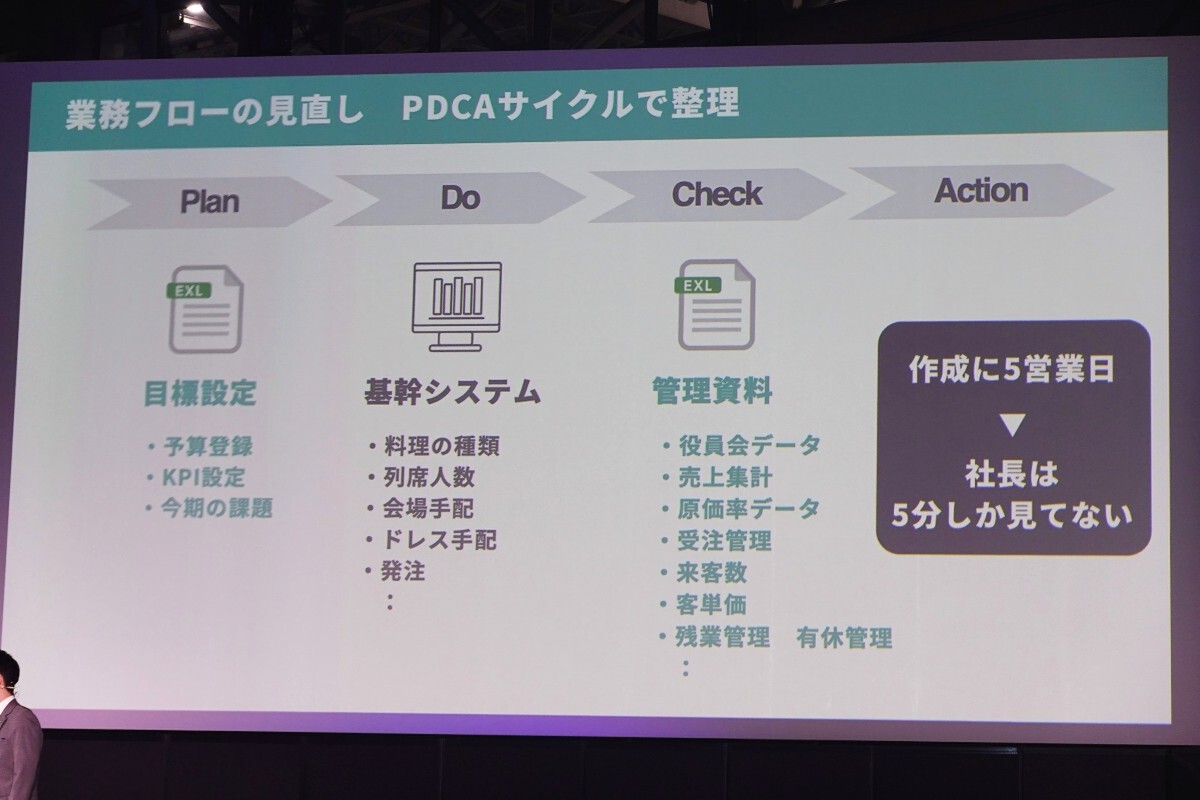 そこで、業務フローをPDCAサイクルで整理してみると、デジタルで管理しているのは「Do(実行)」に関わる情報ばかり。Plan(計画)やCheck(評価)に関する情報は、手作業で集計していた。