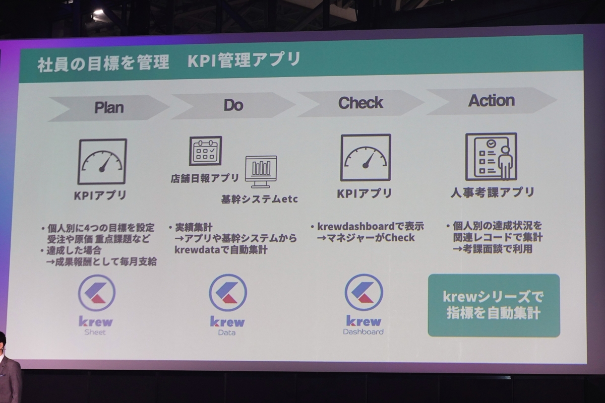 象徴的なのが「KPI管理アプリ」だ。同社では個人別・部門別に受注や原価など4つの目標を設定し(Plan)、達成すれば成果報酬手当を毎月支給している。実績は複数アプリからkrewDataで自動集計され(Do)、プラグインの「krewDashboard」でマネージャーが進捗を確認(Check)。その結果は個人別の人事考課アプリが集計、社員との考課面談で活用され、次のアクションへとつながっていく(Action)。さらに経営指標もいつでも確認できるようになった結果、社員たちは煩雑な資料作りから解放された。