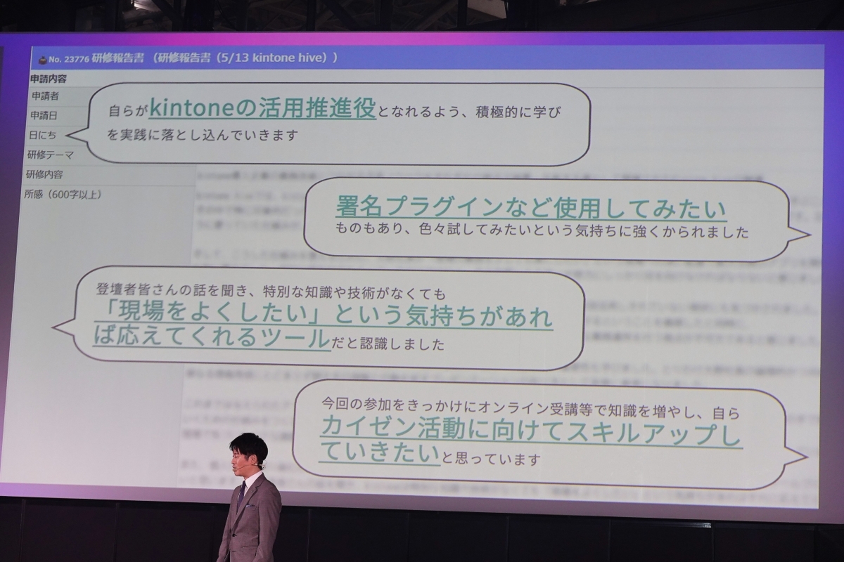社員たちは「私たちは社長に任せきりでいいのか」と意識が変わり、同イベントの報告書には、「kintoneの推進役になりたい」「他社事例にあったプラグインを使ってみたい」という主体的な言葉が並んだ。「とても嬉しかったです。さっそく私は、みんなの学びを後押ししました」(大野氏)